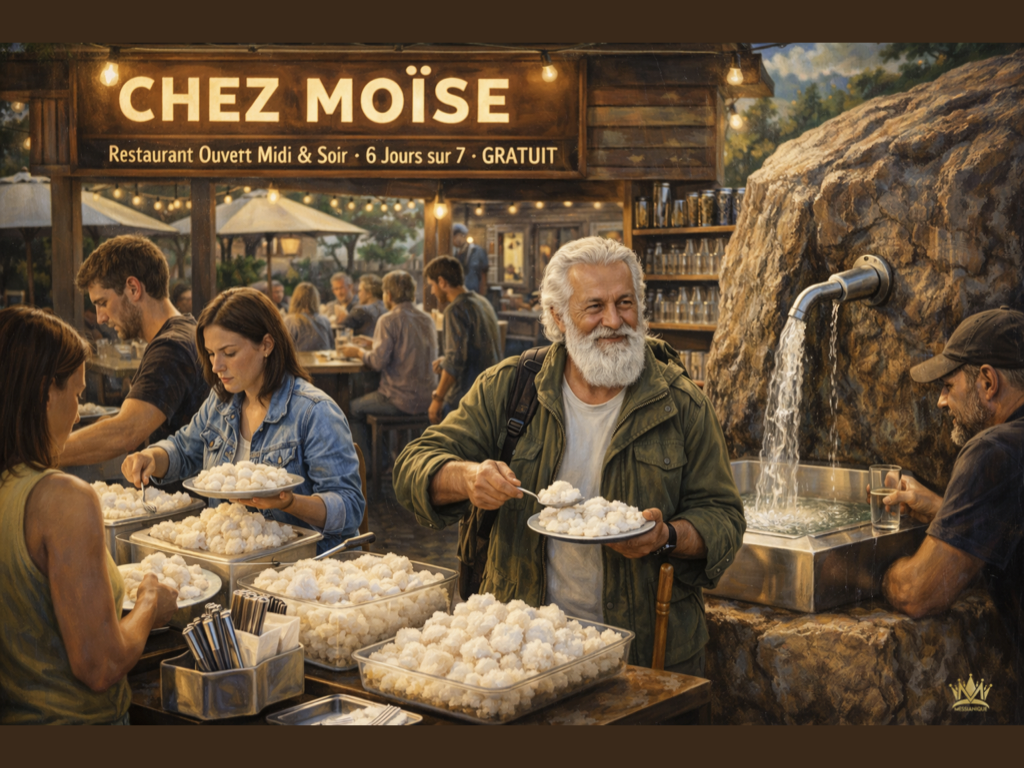 Une nourriture qui tombe du ciel, qui n’étonne personne, une espèce de grain blanc, floconneux, léger, qui prend le goût de ce que l’on a envie de manger. Chaque jour. Pas de stock. Pas de réserve. Tu prends juste ce qu’il faut pour aujourd’hui. On verra demain. Économiquement, logistiquement, mentalement, c’est absurde. Aucun système ne fonctionne comme ça. Et pourtant, ils mangent. Tous les jours. C’est une folie organisée.